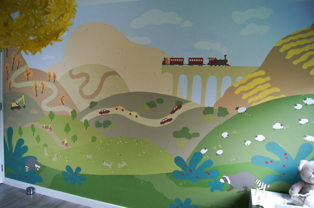 These children’s bedroom murals were designed around the interests and atmosphere of each space. One room belonged to a young boy who loved forest animals and modes of transportation. Existing accents of green and red in the room were carried into the design, forming a playful landscape of hills filled with trains, cars, and animals moving through the scene.