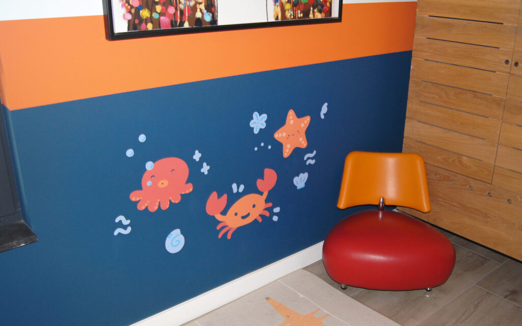 The second room focused on sea animals, with blue and orange as the main colors. Because the space was smaller, the mural was approached in a lighter and more playful way, using smaller painted elements that fit the scale of the room while keeping the atmosphere open and cheerful