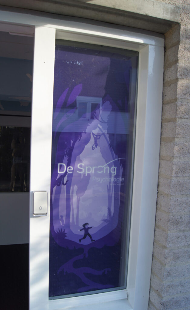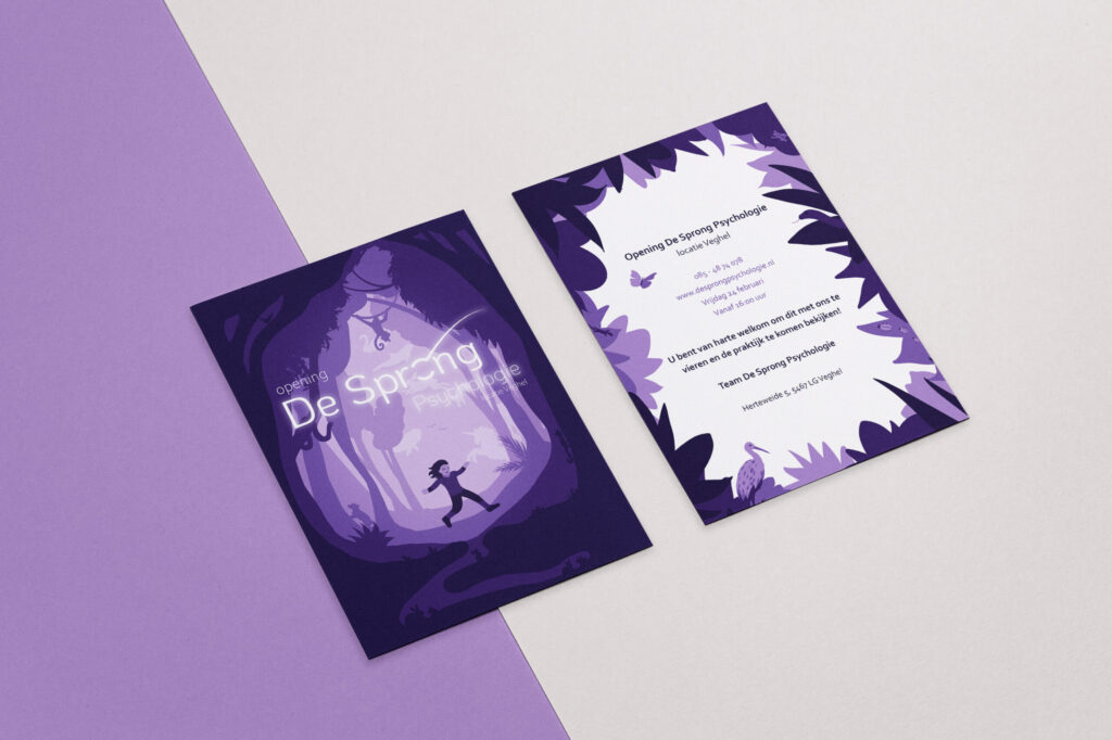 For the opening of the child psychology practice De Sprong, where I created nine murals, I was asked to design an invitation that could also function as a banner for the entrance. The starting point was the practice’s main color, purple, and the idea behind the name De Sprong, the jump.